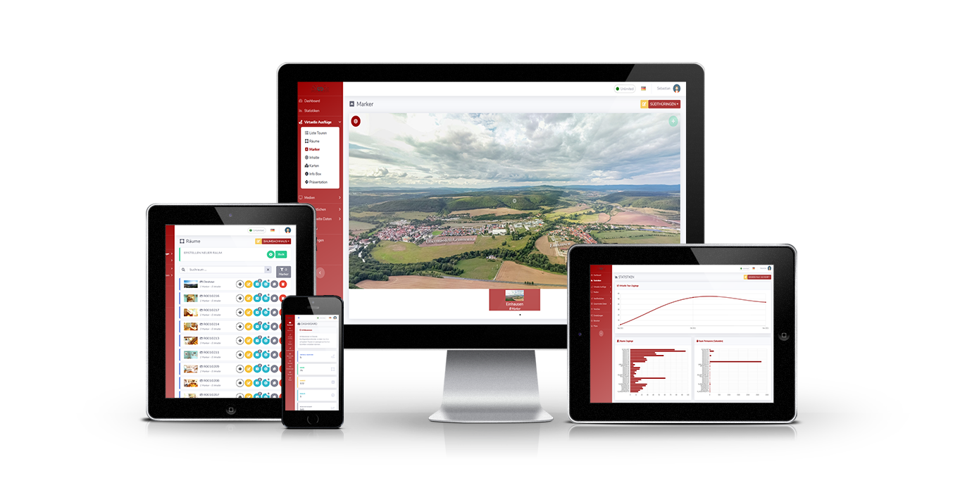 Über unsere Onlineadministration können Sie Ihre Tour von nahezu jedem Endgerät mit einem Internetbrowser bearbeiten. Sie können Inhalte anpassen, Daten hinzufügen, Videokonferenzen anlegen oder auch Ihre Zugriffsstatistiken prüfen.